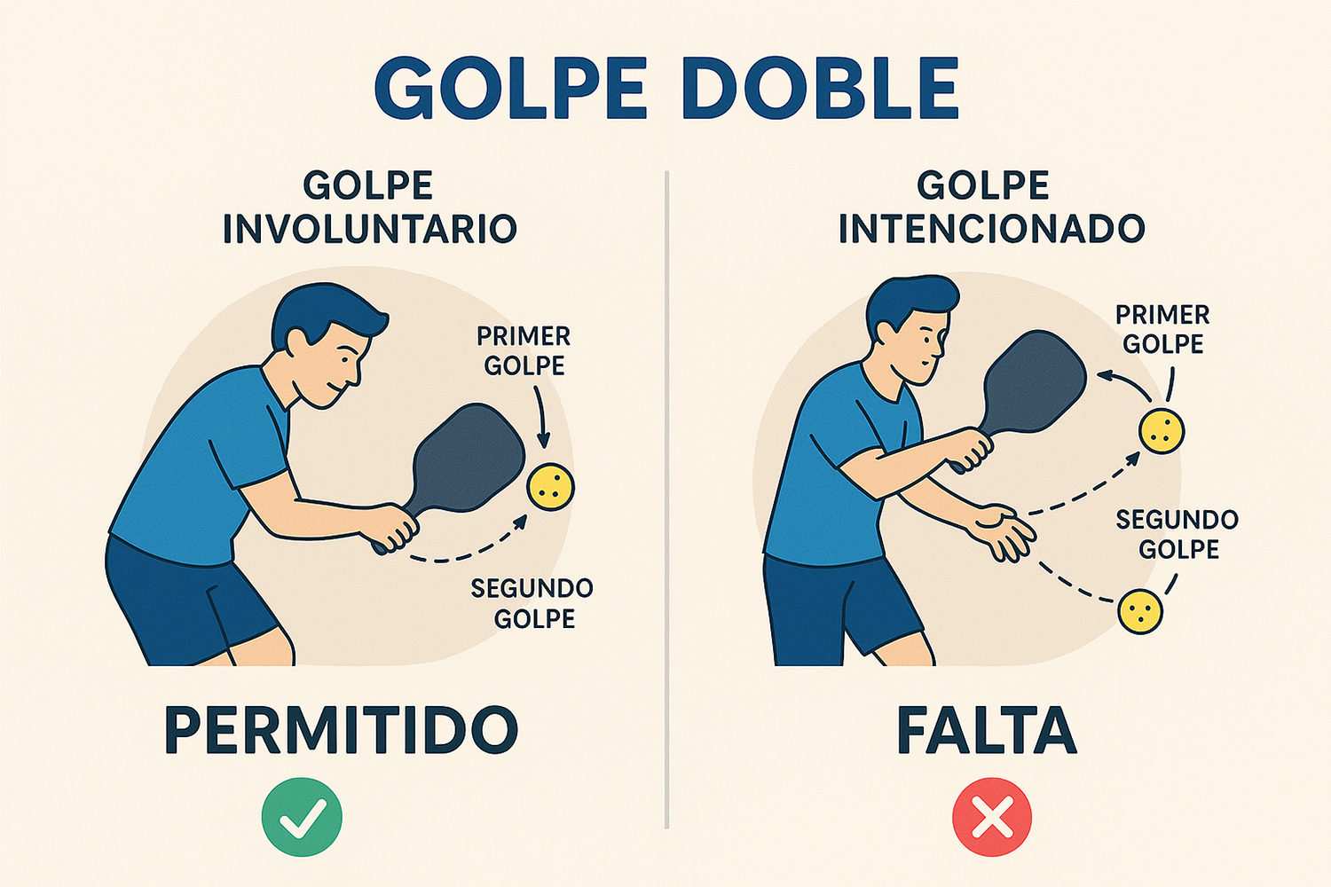 El doble golpe (double hit) ocurre cuando la pelota contacta dos veces con la pala en la misma acción de golpeo. Según la normativa oficial:
