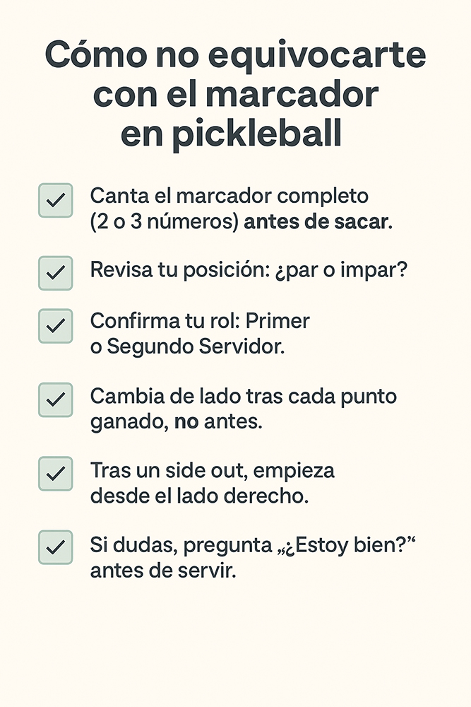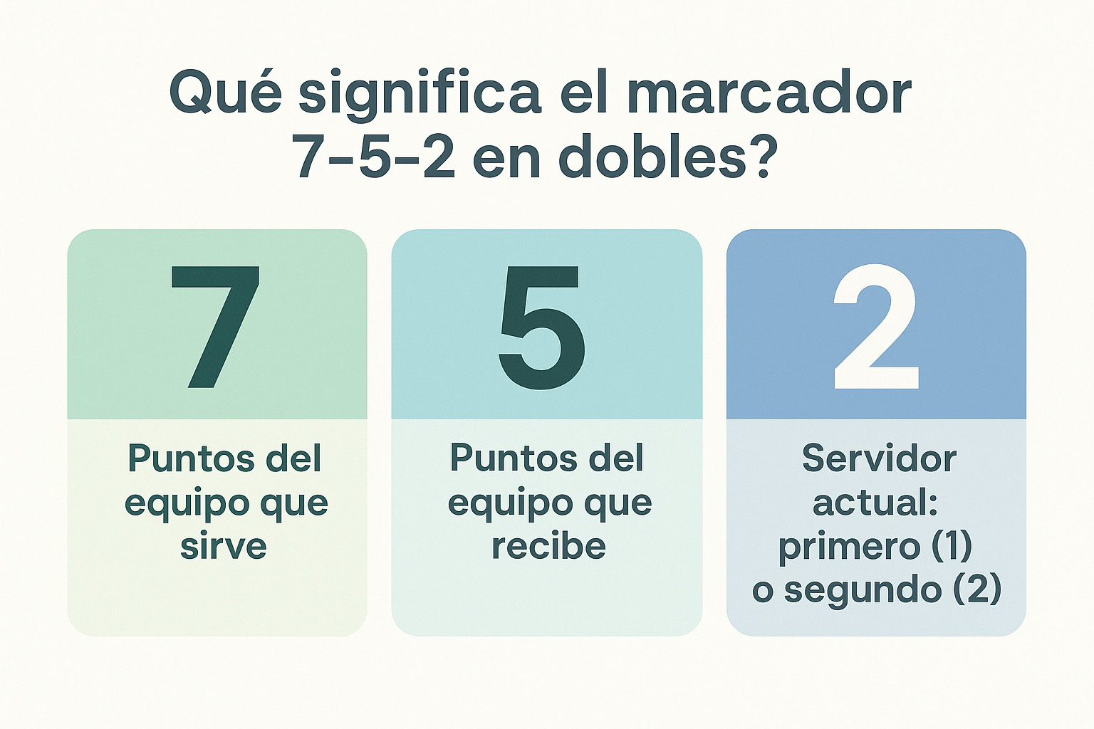 La puntuación en pickleball es sencilla en teoría, pero cuando se mezclan side outs, rotaciones dobles y el famoso marcador «7-5-2», surgen dudas incluso entre jugadores experimentados. Con esta guía —basada en el Reglamento RFET 2025 y su equivalente USA Pickleball— entenderás paso a paso cómo llevar el marcador, cuándo cambia el servicio y qué hacer si alguien se equivoca de posición.