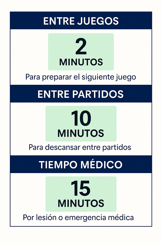 - Tiempo máximo entre partidos: 10 minutos