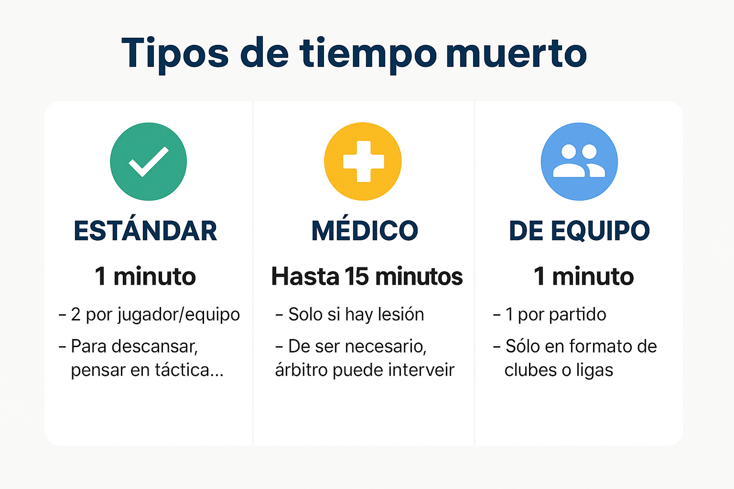 El tiempo muerto estándar es el que cualquier jugador o equipo puede solicitar durante un partido por razones tácticas o físicas (fatiga, concentración, ajuste de material…).
